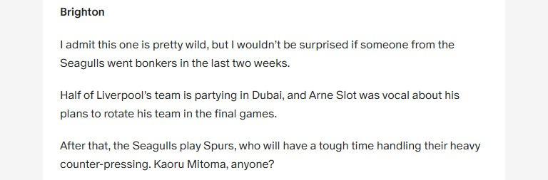 The Spurs vs Brighton match promises a bunch of goals. I mentioned this last week, and indeed, there was a goal from Kaoru Mitoma (let’s pretend he actually started the game):