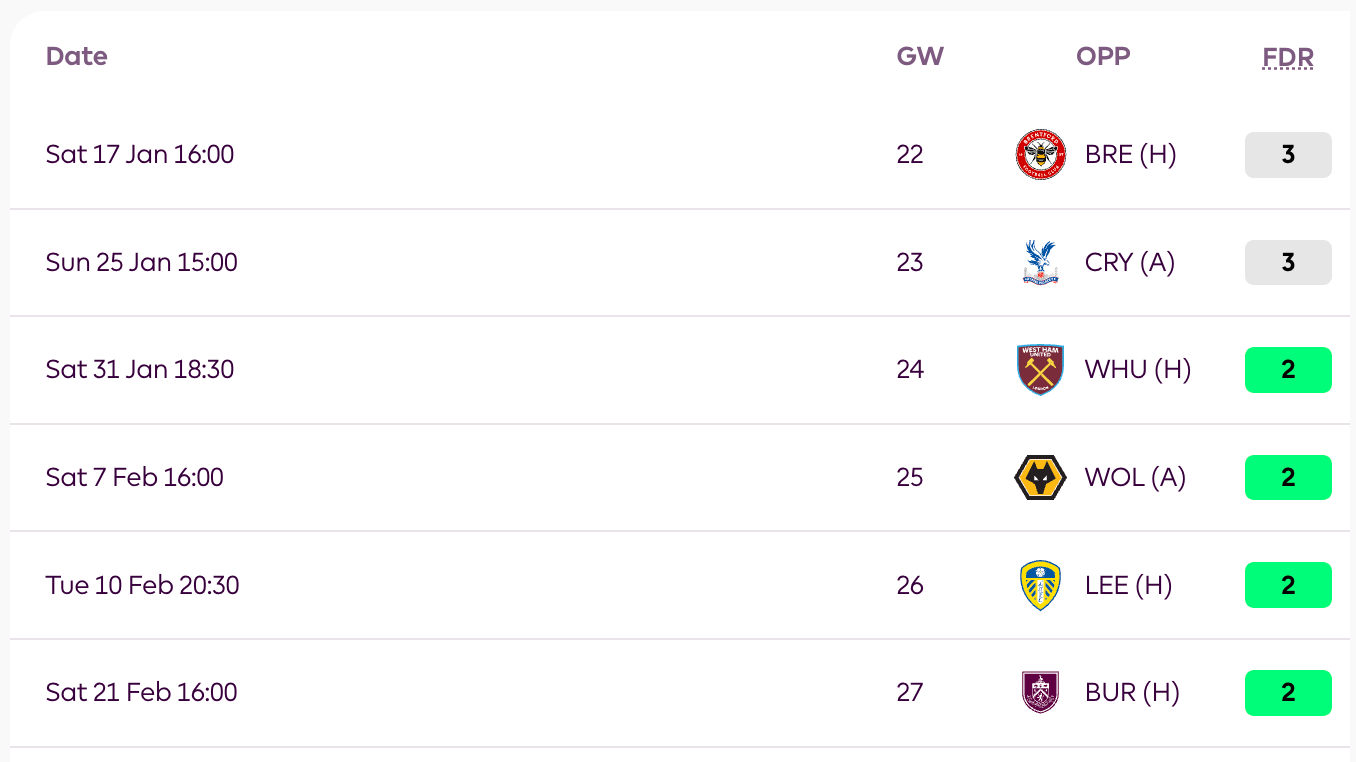 It’s the kind of run that prompts fantasy managers to use their wildcards—it includes matches against West Ham, Wolves, Leeds, and Burnley, with 75% of those games at Stamford Bridge.